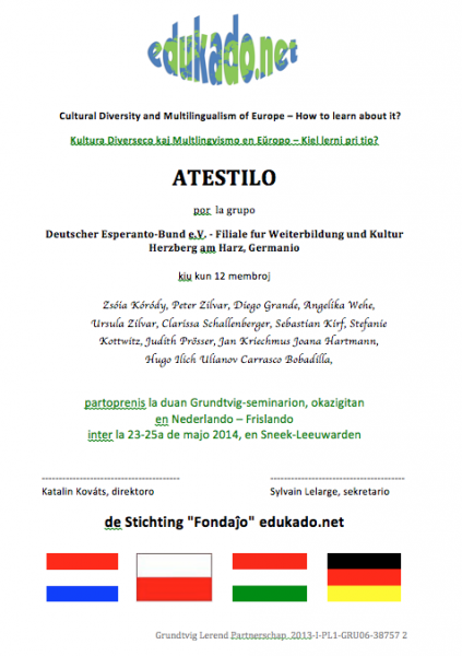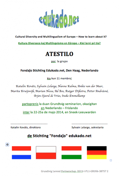 | La 23an de majo la poloj venis al Hago, kaj tagmeze aliĝis al ili ankaŭ la hungara delegacio kun 8 personoj. Vespere ni ĉiuj vojaĝis al la nordo, al la frisa urbo Sneek, kie ni renkontis ankaŭ la germanan grupon de 12 personoj. Kaj komenciĝis la frisa programo kies ĉefgastigantoj estis la frisa-Esperanto muzikgrupo Kajto. Nanne kaj Ankie ĉiĉeronante vizitigis al ni la frisajn urbojn: Sneek, Hidenloopen kaj Leeuwarden, kie sabaton ni ĝuis ankaŭ la aranĝojn de la tiea stratfestivalo. En la hotelo de Sneek okazis ankaŭ specialaj kulturaj aranĝoj: la folklora dancgrupo De Ljouwerter Skotsploech prezentis sian programon kaj rakontis pri kutimoj kaj vestaĵoj. Sekvonttage Kajto kaj Kapriol' okazigis seminarion kun muzika akompano kaj dancigo. Kapriol’ prelegis pri Frislando kaj la frisa lingvo, Kajto pri unikaj aspektoj de Frislando kaj ties kulturo (sporto, bestoj, manĝkutimoj kaj trinkaĵoj). Kompreneble ne mankis ankaŭ viva gustumado. Frisa paro gastis ankoraŭ en la programo, rakontante pri siaj vestaĵoj kaj vivo. La muziko kaj dancoj, en kiuj ankaŭ la gastoj partoprenis, faris la programon riĉa travivaĵo. Pri la prelego kaj aliaj temoj pri Frislando en la sekcioj LIBERAJ STUDOJ ĉe www.edukado.net aperos dekleciona reta kurso pri FRISLANDO, kun tekstoj, testoj, sonmaterialoj kaj filmoj por ke esperantistoj tutmonde povu ekkoni niajn malkovrojn pri tiu minoritato de Nederlando. Pri la lanĉo de la kurso ni aparte informos vin. Roman Dobrzyński kaj Katalin Kovats kune faros kaj publikigos filman raporton pri la frisaj tagoj. Jen resuma dokumento pri nia programo, pli-malpli sekvita estas ĉi tie. Fotoj en la ALBUMO. Jen la elŝuteblaj grupaj atestiloj pri la partopreno    |  |