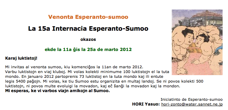 Ĉu vi pretus konkurse kun vi mem legi literaturaĵon en Esperanto? Aliĝu al la Sumoo-grupo, organizita de Hori Yasuo.