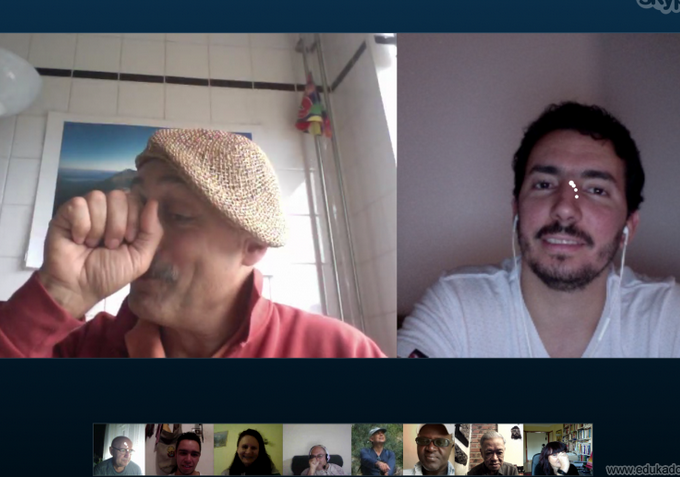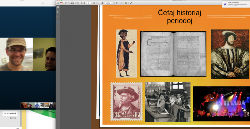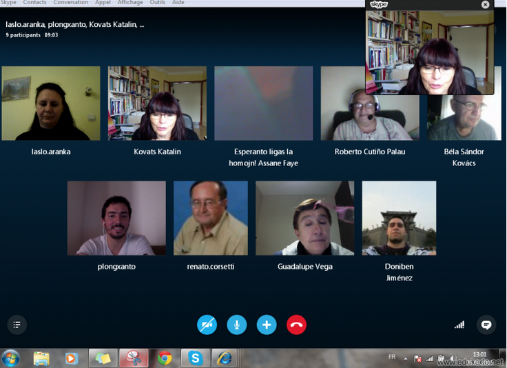 Bonŝance ankaŭ la teknikon ni sukcesis venki, kaj el Nederlando ni kunigis esperantistojn el 16 landoj, Argentino, Aŭstralio, Brazilo, Ĉinio, Danlando, Ekvadoro, Hispanio, Hungario, Islando, Italio, Kolombio, Meksiko, Senegalo, Serbio, Svislando kaj Vjetnamio. Plurfoje sidis ne nur unu, sed 3 ĝis 14 personoj ĉe la sama komputilo. Aparta danko al Mónika Molnár, kiu kunigis 14 kursanojn en Chaux-de-Fonds, Svislando. Kompreneble 30-45-minutoj estas sufiĉaj nur por gustumigi iun landon aŭ lingvon, sed kelkaj kursgvidantoj disponigis ankaŭ sian prelegmaterialon, kiel ekzemple post la vjetnama leciono ni dissendis frazaron kun sondosieroj, post la franca kaj okcitana aldonajn materialojn. |