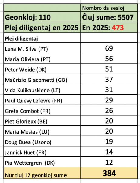 Ni kore dankas niajn 12 geonklojn, kiuj okazigis almenaŭ 12 sesiojn en la jaro 2025.