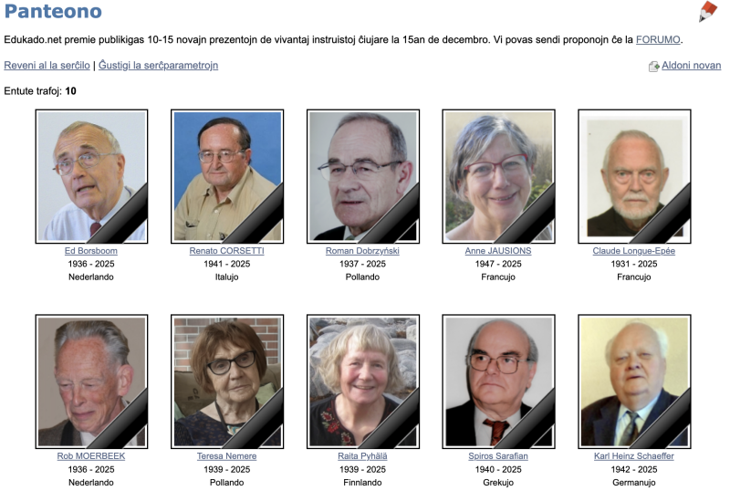En 2025 ni perdis multajn karajn kolegojn, el kiuj preskaŭ ĉiuj, bonŝance vive, jam eniris la Panteonon, do, iliaj propraj tekstoj donis bonajn bazojn por nekrologoj kaj memorartikoloj. La prezentoj tre bone taŭgas ankaŭ por tio, ke ni kolektu memoraĵojn pri tiuj homoj por la posteuloj kaj familianoj de la foririntoj. En la unua suba bildo vi vidas la dek ĉi-jare perditajn kolegojn. Ni invitas vin klaki al la bildo, viziti la retpaĝon kaj trovi tiujn, pri kiuj vi ŝatus postlasi viajn pensojn kaj sentojn.