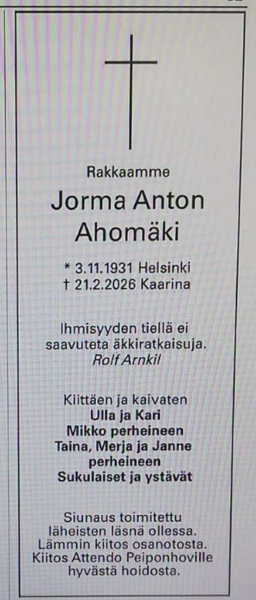 Ni informas vin ke la 21an de februaro 2026 forpasis eminenta kaj multflanka finnlanda esperantisto Jorma Ahomäki (1931-2026).Profesie Jorma estis pedagogo, laboris kiel lernejestro kaj rektoro. Esperanton li eklernis en 1959 de Andreo Cseh. Ekde 1966 ĝis 2009 li instruis Esperanton, inter aliaj dum la (Somera) Universitato de Turku, kaj poste en diversaj vesperaj kursoj kaj programoj. Post 2009 li lernigis individuojn per skajpo. Dum siaj multaj vojaĝoj kaj organizado de prelegoj de eminentaj esperantistoj, plie danke al la kunlaboroj kun radistacioj kaj revuoj li fariĝis konata kaj ŝatata en Esperantujo ankaŭ internaciskale. Nia redakcio esprimas siajn kondolencojn al la familio, la finna movado kaj al ĉiuj, kiuj havis la honoron kunlabori aŭ rilati kun Jorma. Ripozu li en paco. Viajn omaĝvortojn kaj memoraĵojn vi povas postlasi en la Panteono. |